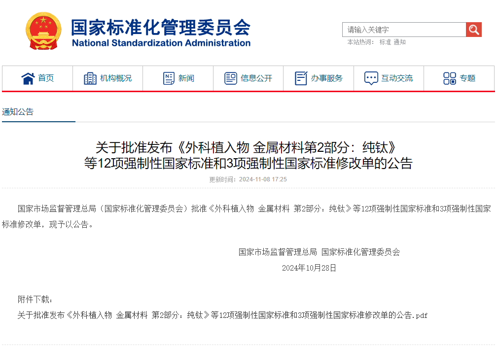 關于批準發布《外科植入物 金屬材料第2部分:純鈦》等12項強制性國家標準和3項強制性國家標準修改單的公告